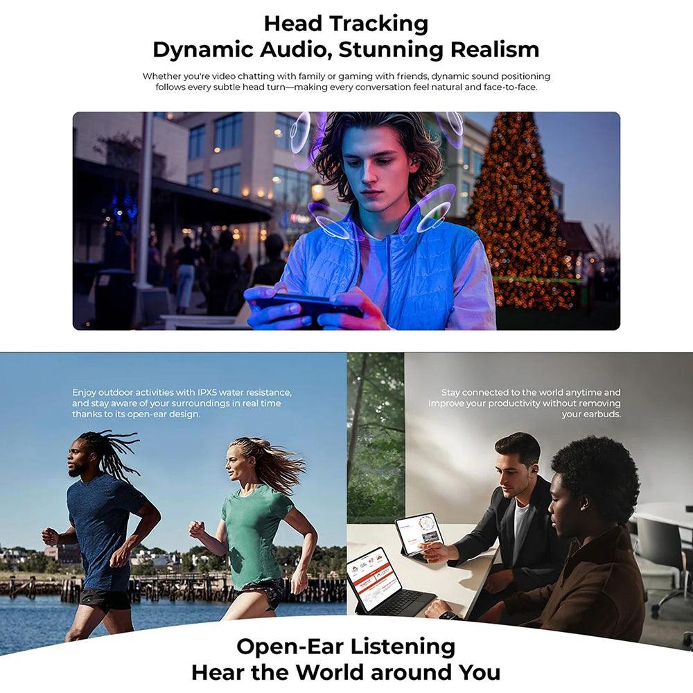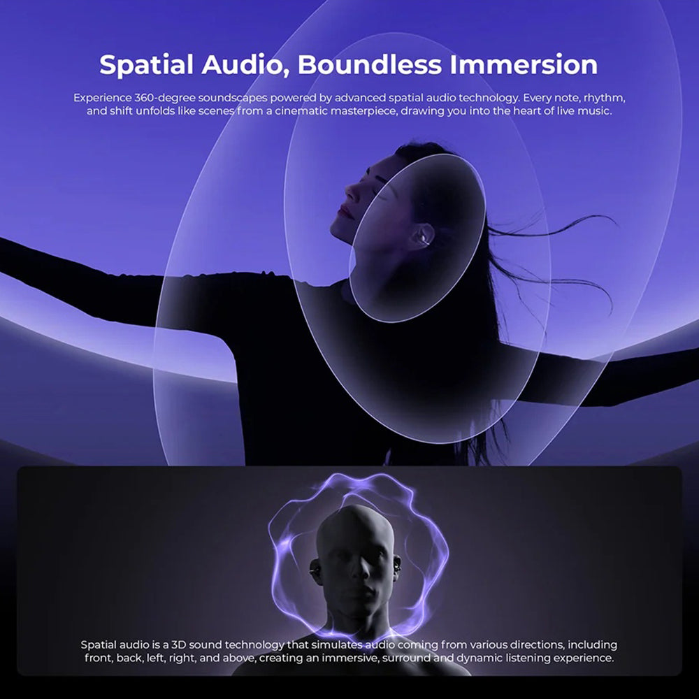 La technologie open-ear élimine la pression dans le canal auditif, offrant une expérience d'écoute naturelle et sans inconfort, même après de nombreuses heures d'utilisation.