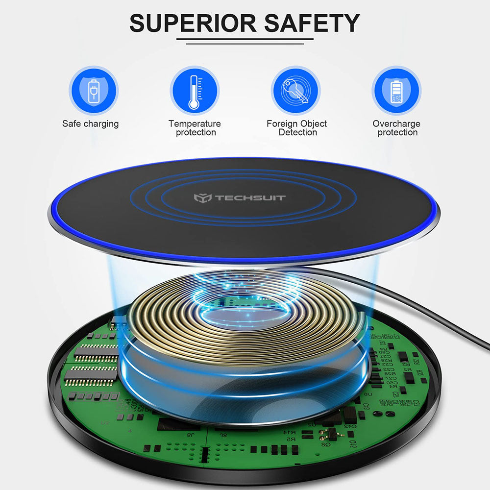 • Hai trovato quello giusto per te. Il caricabatterie wireless di Techsuit carica rapidamente i tuoi dispositivi. Goditi tutti i vantaggi offerti. Il caricabatterie wireless Qi è a solo un clic di distanza.